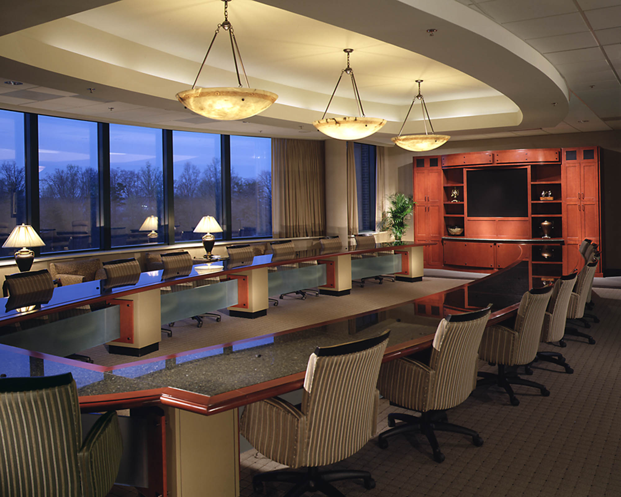 The corporate offices and board room have similar finishes as the branch. The board room allows visibility between attendees and easy presentation access along with updated audio visual system.