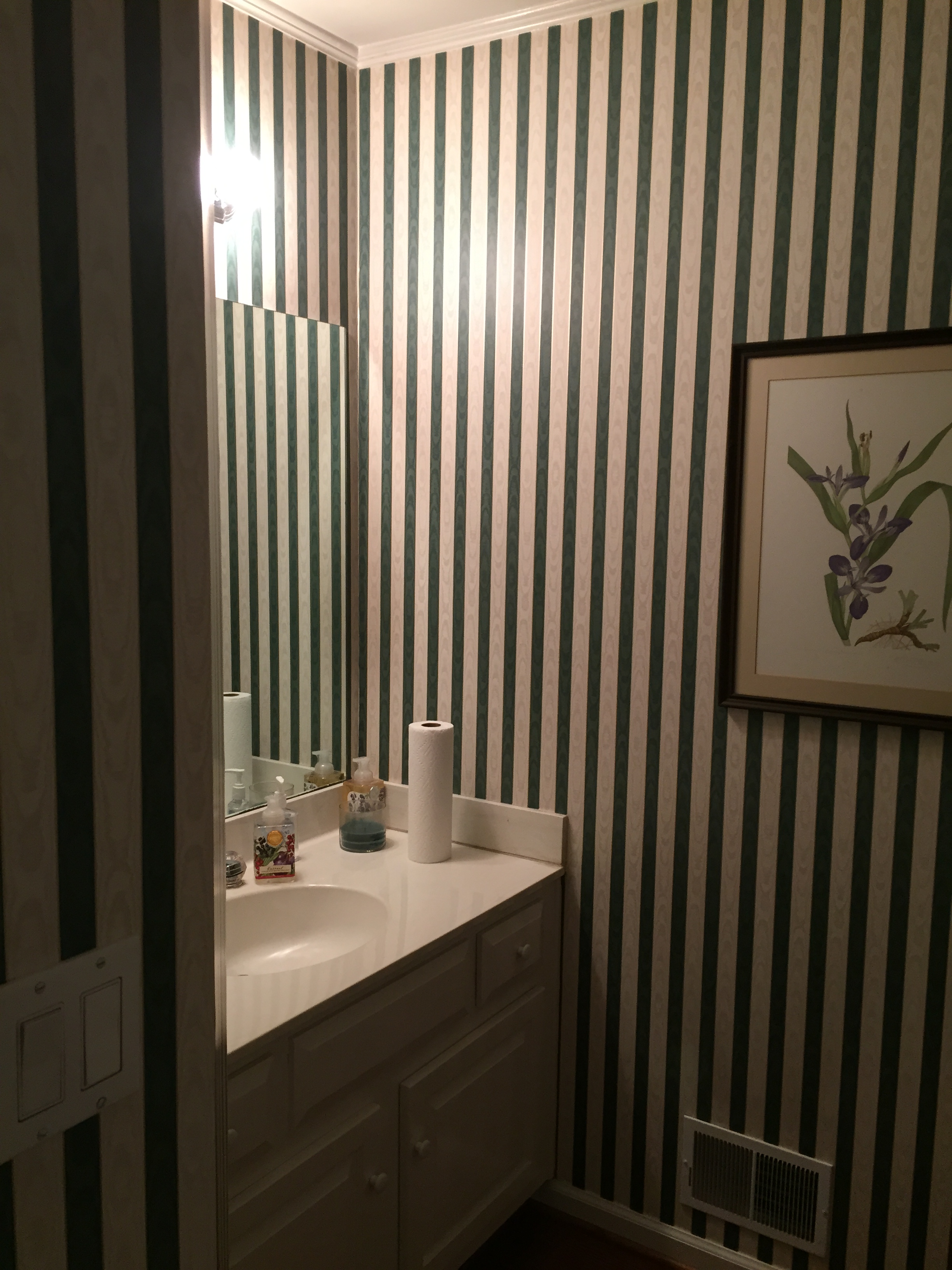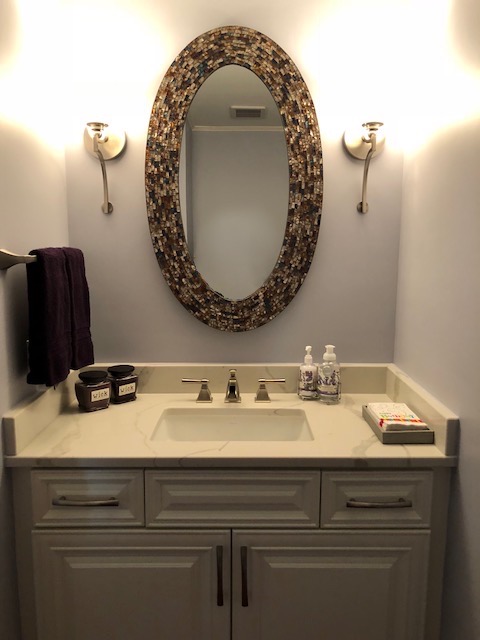 At the powder room on the first floor, cosmetics were all that were needed. Wall finishes, lighting and mirrors helped brighten the space and make it more welcoming.