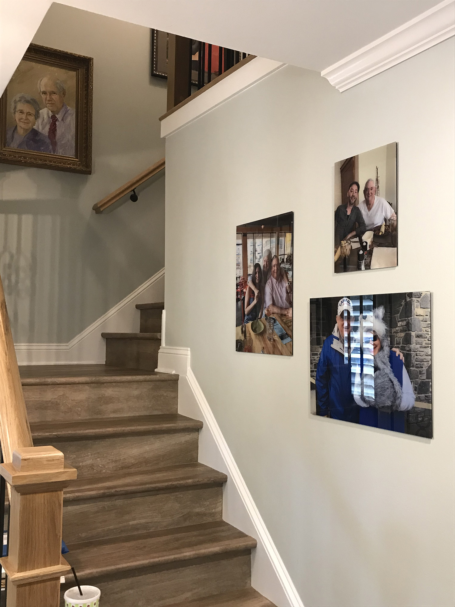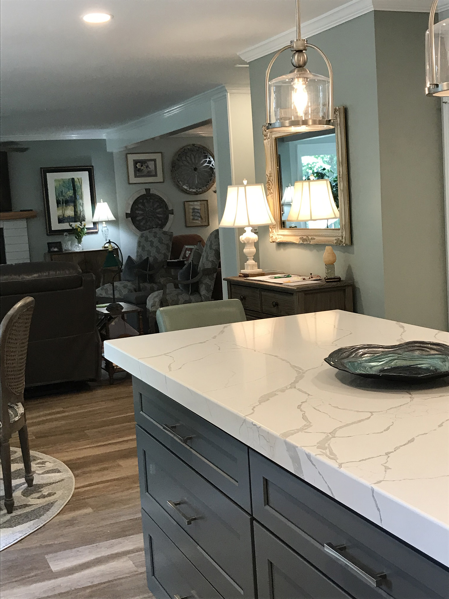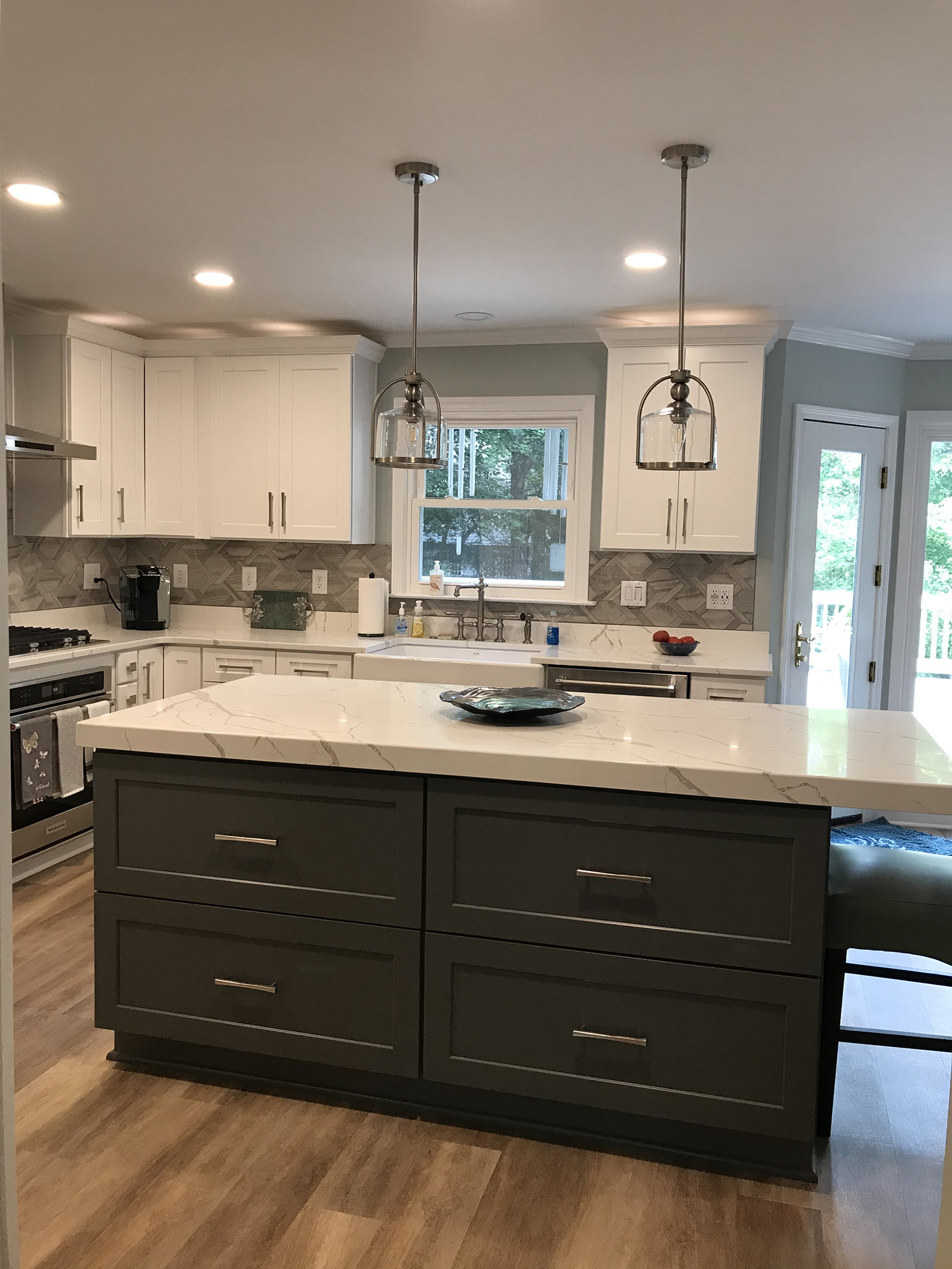 All new luxury vinyl wood floors were installed, new wall finishes (removed the paneling in the den), new stair railings, new lighting and ceiling fans, new kitchen cabinets and new quartz countertops. The white cabinets were increased in height for additional storage with undercounter lights and lighting above the cabinets added. The wall for the oven and refrigerator was made to appear to be built in with a pull-out shelf and electrical outlet inside for small appliances. A dark gray island was created with drawers to maximize storage and provide layout space while entertaining.